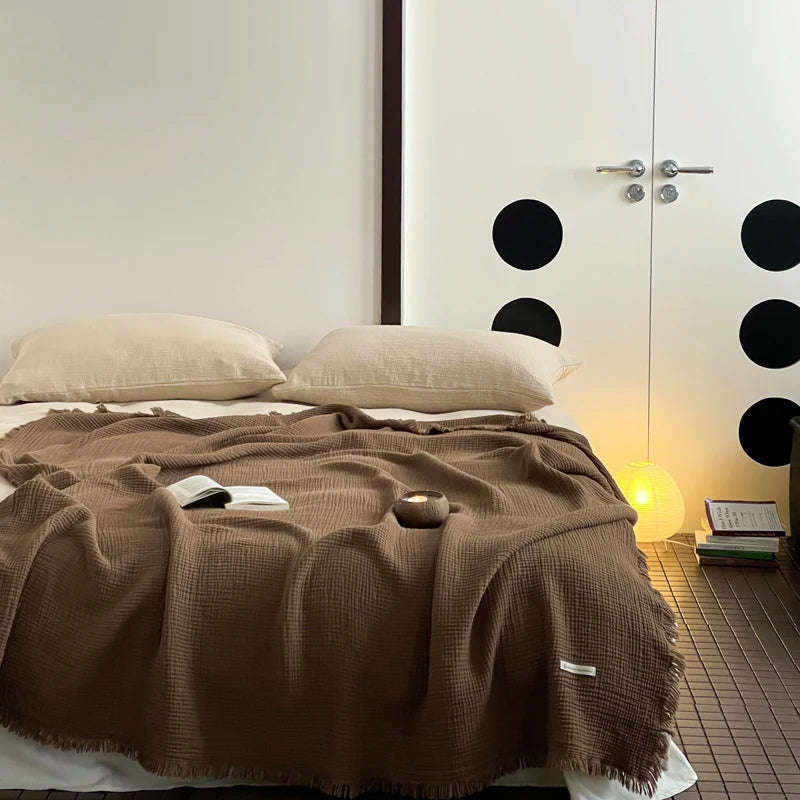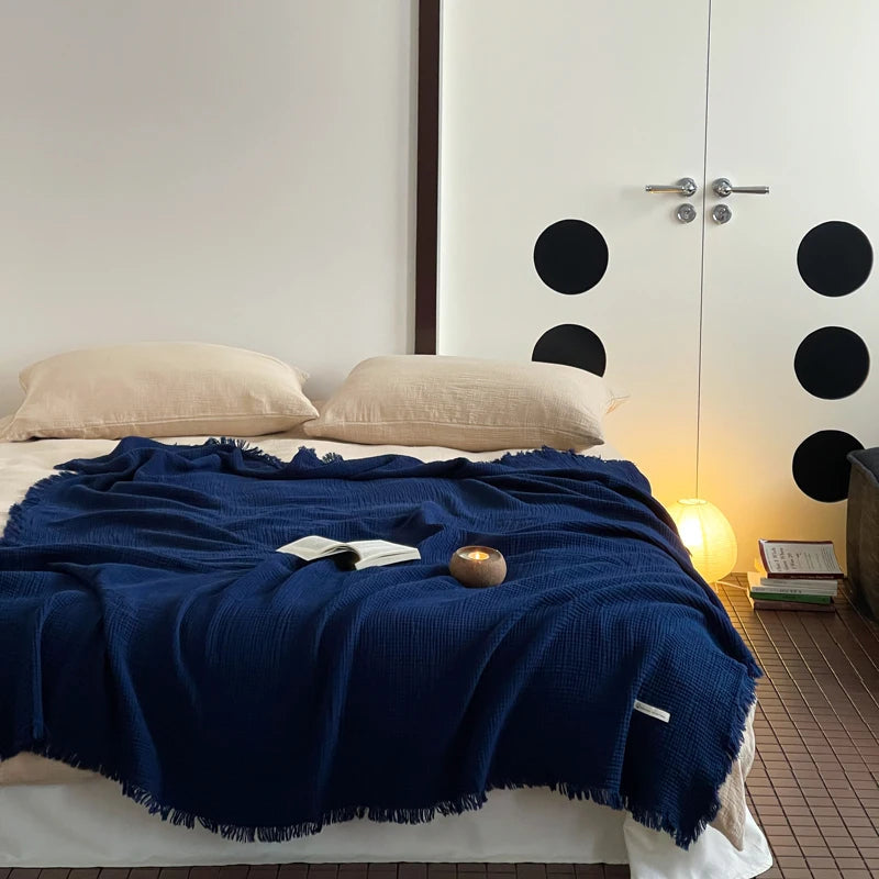 This cotton throw blanket is your go-to for warm nights. Textured, tassel-trimmed, and easy to layer.